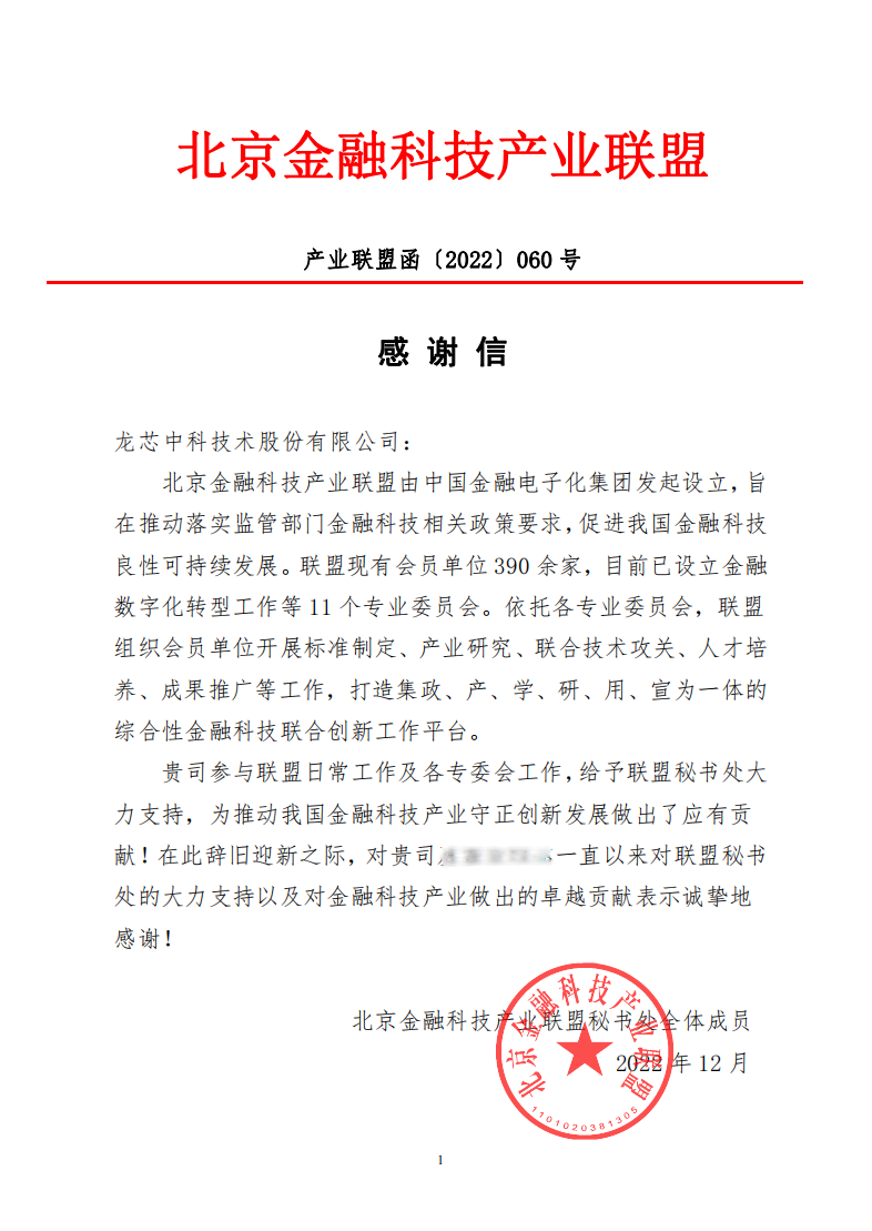 另,北京金融科技产业联盟近期致函龙芯中科,对龙芯中科大力支持综合性金融科技联合创新工作平台建设,推动我国金融科技产业守正创新发展,予以肯定和感谢!