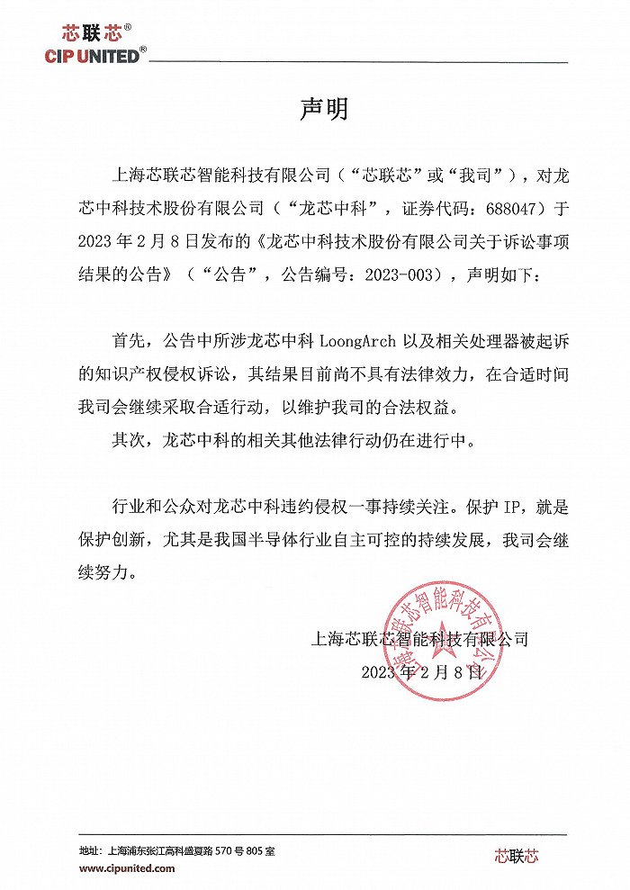 2月8日,上海芯联芯智能科技有限公司官网发布声明称,龙芯中科此前公告中所涉龙芯中科LoongArch以及相关处理器被起诉的知识产权侵权诉讼,其结果目前尚不具有法律效力,在合适时间公司会继续采取合适行动,以维护公司的合法权益。龙芯中科的相关其他法律行动仍在进行中。