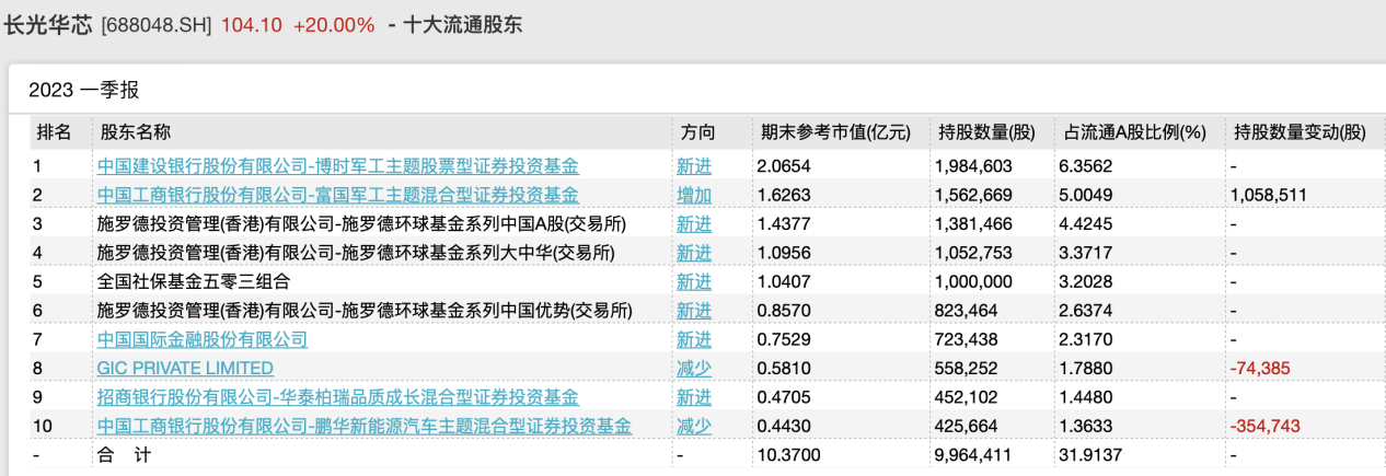 一季度,长光华芯十大流通股东中,出现了两个“新面孔”。博时基金和施罗德投资管理(香港)有限公司成为新进十大流通股东。