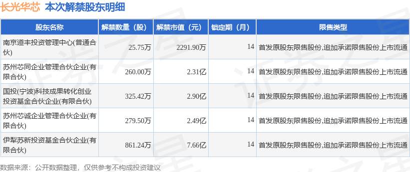 根据市场公开信息整理,长光华芯(688048)于6月19日将有1751.92万股限售股份解禁上市,为公司首发原股东限售股份,追加承诺限售股份上市流通,占公司总股本9.94%。最近一年内,该股累计解禁1814.13万股,占总股本的10.29%。本次解禁后,公司还有9716.35万股限售股份,占总股本55.12%。具体如下图所示:
