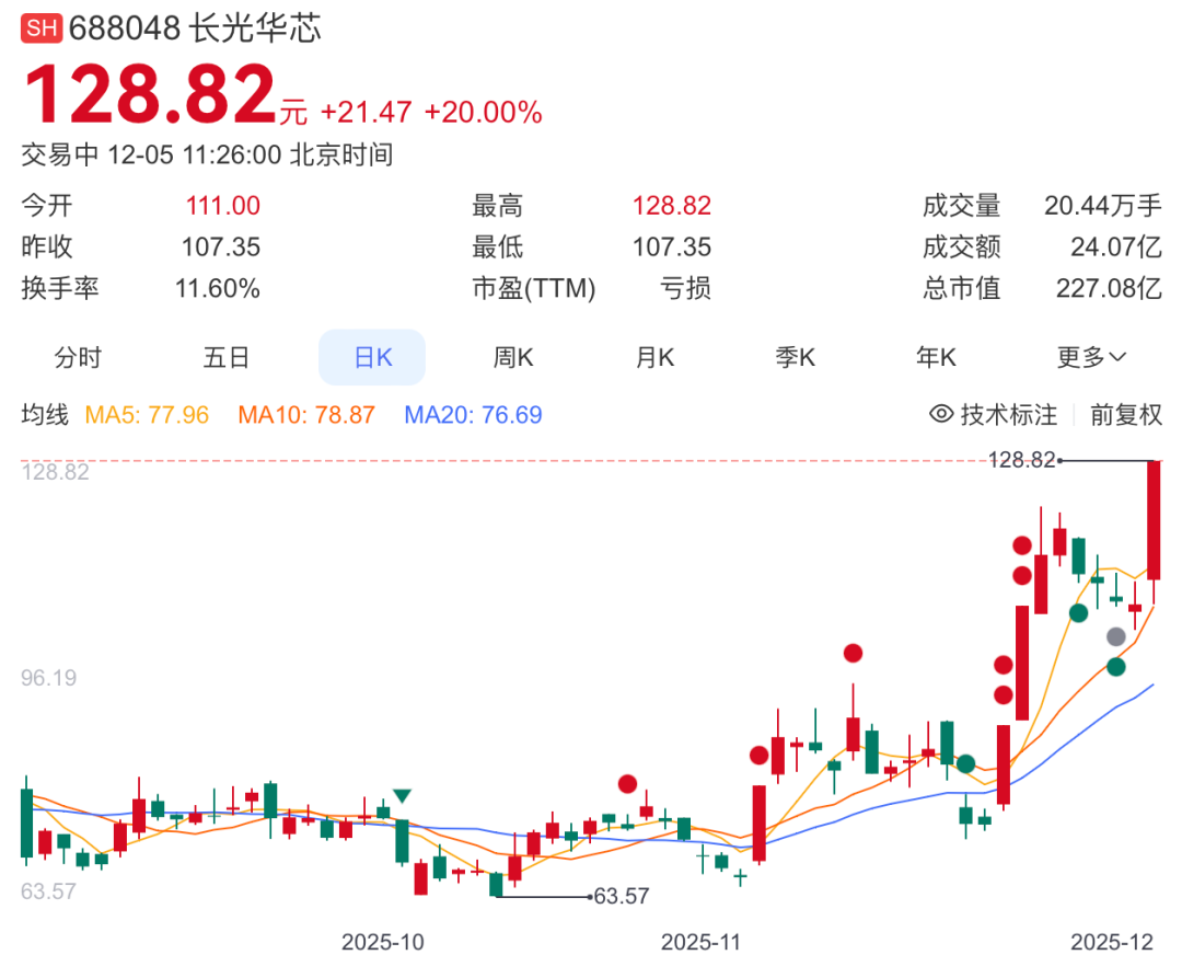 截止发稿, 长光华芯 市值已达227亿元,股价相比一个月前接近翻倍,一年时间里更是增幅超过200%。