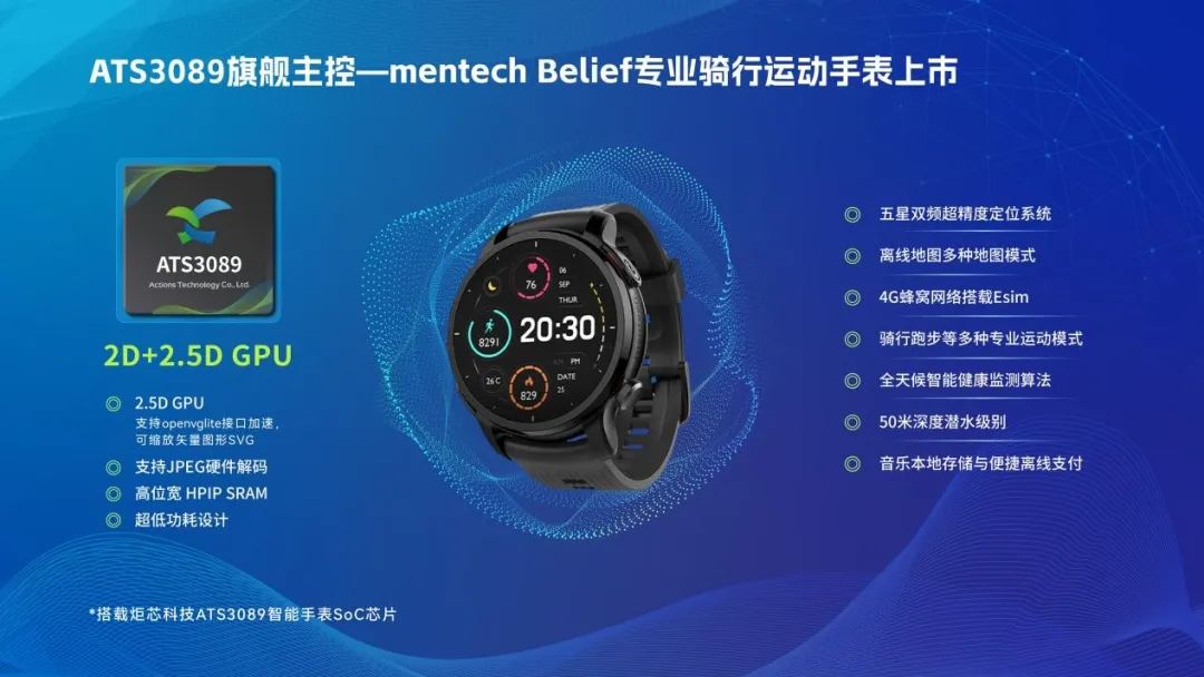 mentech,全球低碳先锋品牌,专注于为全球消费者提供智能化骑行装备产品,于2024年12月27日推出重磅新品——Belief专业骑行运动手表,一款重塑骑行体验的全能型智能运动手表。Belief专业骑行运动手表采用了炬芯科技ATS3089智能手表SoC芯片。