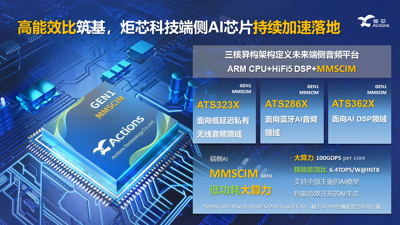 在人工智能时代, 炬芯科技 基于存内计算技术路径踏出了打造端侧AI大算力第一步,推出CPU+DSP+NPU三核异构的端侧AI芯片平台,提供低功耗、大算力、高能效比、高集成度和高安全性的端侧 AIoT 芯片产品,推动 AI 技术在端侧设备上的融合应用,助力端侧AI生态健康、快速发展。