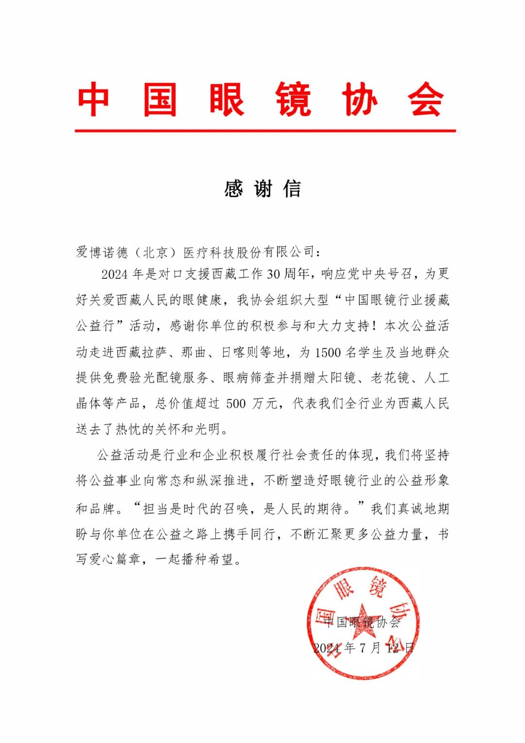 近日,中国眼镜协会联合西藏慈善总会发起爱眼护眼公益活动,走进拉萨、日喀则、那曲等地,为西藏人民送去关怀和光明。爱博医疗为活动捐赠公司自主研发生产的用于白内障手术的中高端人工晶状体,以实际行动践行社会责任。