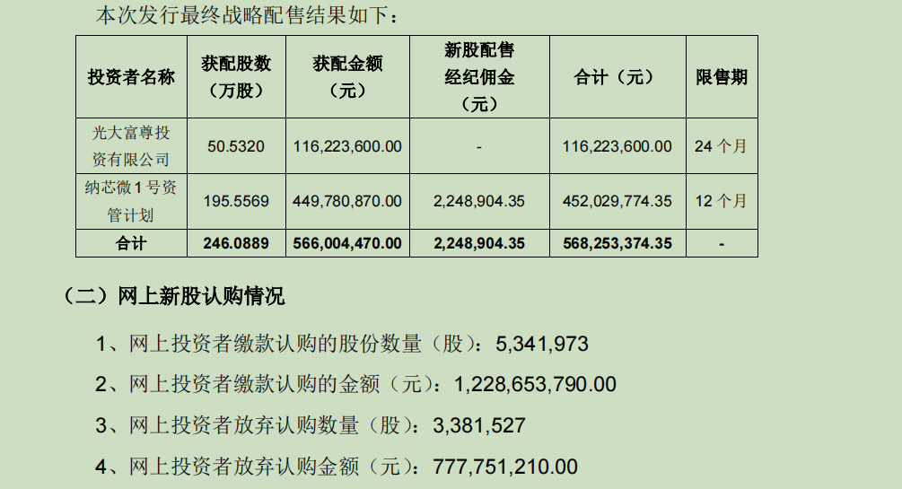 昨日,光大证券保荐的科创板新股纳芯微公告的发行结果显示,此次发行网上投资者放弃认购总金额达7.78亿元,而这些弃购余股将由主承销商光大证券负责包销。