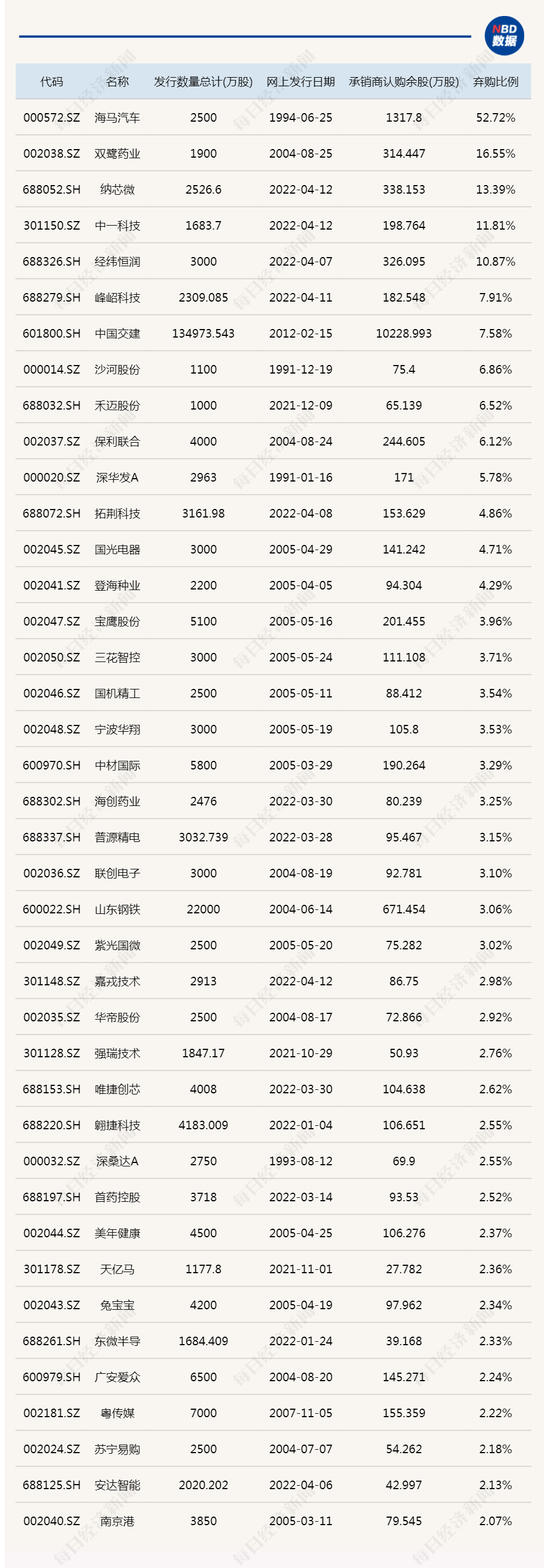 实际上,纳芯微的大比例弃购在最近一段时间已经不是个案。据统计,A股历史新股发行弃购比例排名前6的新股中有4只新股的发行时间为今年4月份。