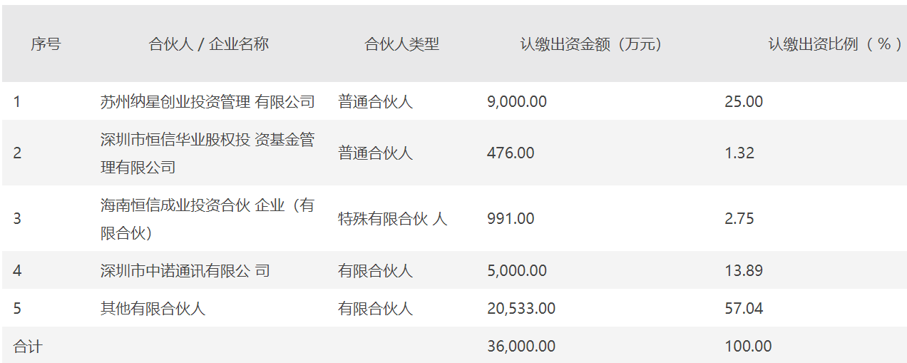 标的基金由普通合伙人恒信华业、苏州纳星与特殊有限合伙人海南恒信成业投资合伙企业(有限合伙)(以下简称“恒信成业”)、有限合伙人深圳市中诺通讯有限公司等其余25名合伙人共同设立,总募资规模为3.6亿元。其中,纳芯微全资子公司苏州纳星作为普通合伙人以自有资金人民币9000万元参与认购标的基金份额,出资比例占基金募集总额的25%。