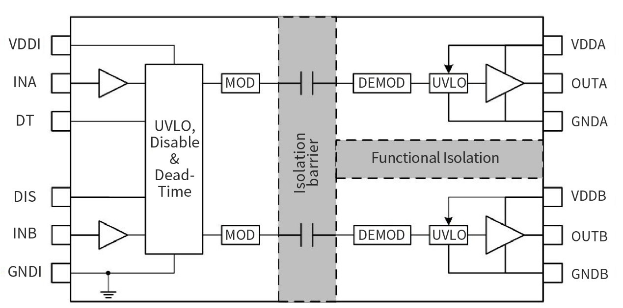 根据NSi6602的逻辑表,DT脚实现输出Interlock功能或者死区调节功能。同时,NSi6602输入信号和输出信号隔离,这样便于PCB板布线,进一步提升抗干扰性能。NSi6602抗共模干扰能力CMTI高达150V/ns,这个在大功率短路和过流保护的时候很重要。另外其上下驱动的差模电压可达1500V,也适用于900V氮化镓器件以及三相系统的应用。
