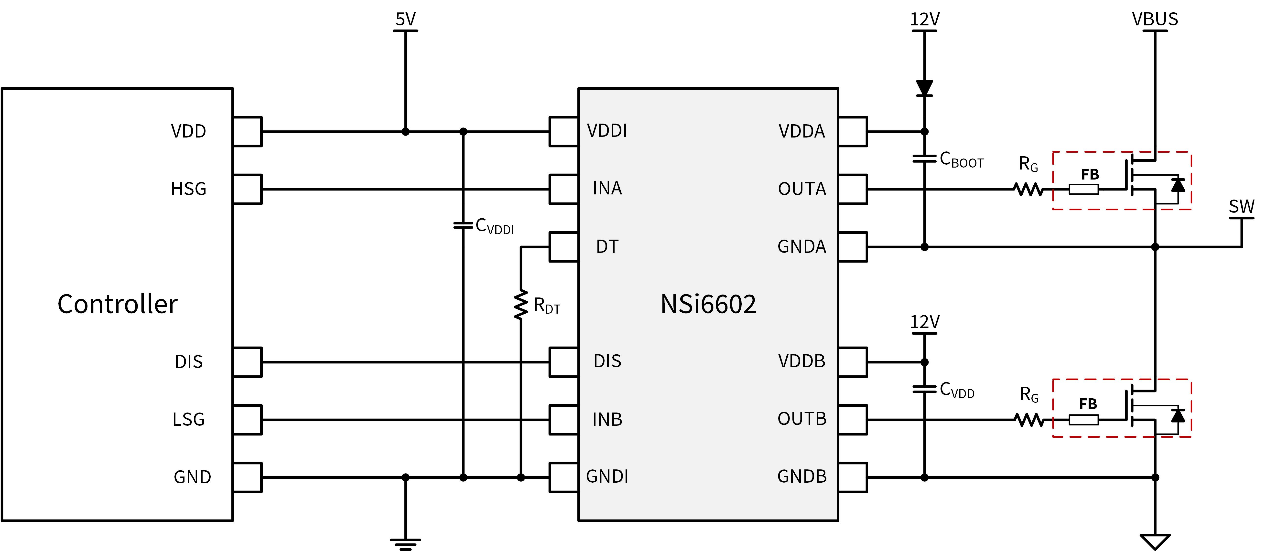 镓未来应用开发团队具有丰富的数字控制和模拟控制经验,已经将半桥氮化镓驱动电路归一化,即统一采用纳芯微NSi6602隔离驱动器。