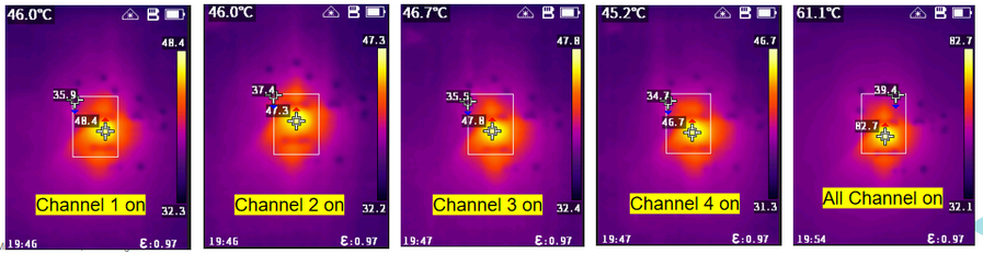 图 2 单通道1A与4通道并联3A负载下温度表现