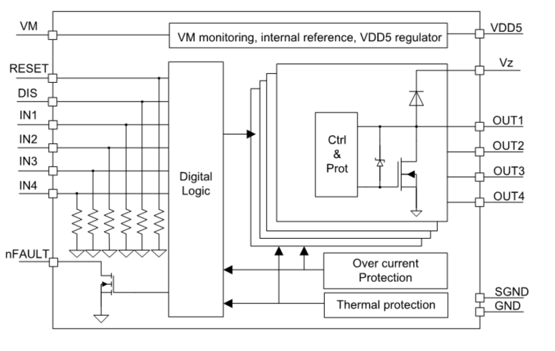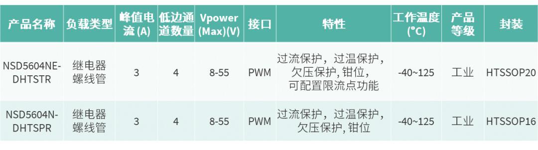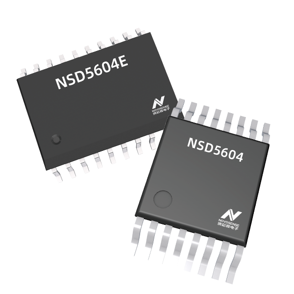纳芯微全新推出NSD5604E/NSD5604系列4通道低边驱动产品,该产品集成了4通道低边NMOSFET,可以驱动阻性,容性或者感性负载;4个通道可以同时导通,单通道支持500mA以上,4通道并联支持2A以上负载电流;支持独立过流保护,且过流点可以通过外部电阻进行配置,过流保护通道间相互独立;此外,NSD5604还集成有源钳位与续流二极管,支持使用外部TVS,可以实现感性负载,实现不同电流衰减模式包括慢速衰减与快速关断。