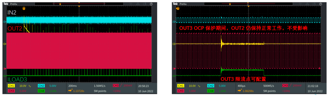 工业现场环境复杂,存在各种干扰情况:一方面供电干扰与接地措施不当等会引入电源干扰;其次控制器与执行单元接线距离较长也会导入工业现场大功率设备产生的电磁干扰;最后由于施工人员不正确的接线方式,短路情况也会频繁发生。NSD5604为应对输出端有可能产生的短路现象,能够提供可靠的短路保护功能。如图4所示各通道间的短路保护功能相互独立,单通道峰值电流可达3A。NSD5604E Enhanced加强版本方案还提供可配置限流保护功能,可对限流点与限流时间进行灵活配置,提升NSD5604在复杂负载条件下鲁棒性,防止因为输出滤波电容或者导线寄生参数产生变化时,芯片出现误关断的情况。
