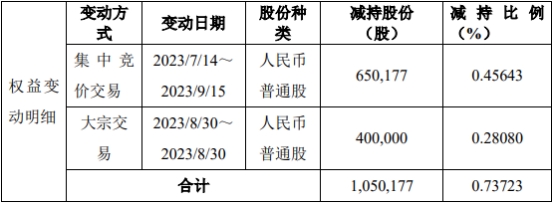 简式权益变动报告书显示,2023年7月14日至2023年9月15日,国润瑞祺通过集中竞价交易和大宗交易方式累计减持纳芯微的股份总数共计1,050,177股,其中,通过集中竞价交易方式累计减持650,177股,通过大宗交易方式累计减持400,000股,累计减持比例合计为0.73723%。减持交易股份性质为无限售流通A股。另外,因股票激励归属致公司总股本由141,489,600股增加至142,448,854股,国润瑞祺持股比例被动稀释。上述变动累计导致国润瑞祺拥有权益的股份比例降至5%以下。