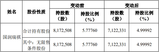 本次权益变动前,国润瑞祺合计持有纳芯微股票8,172,508股,占纳芯微总股本141,489,600股的5.77760%。本次权益变动后,国润瑞祺持有7,122,331股,占纳芯微总股本142,448,854股的4.99992%,不再是纳芯微5%以上的股东。