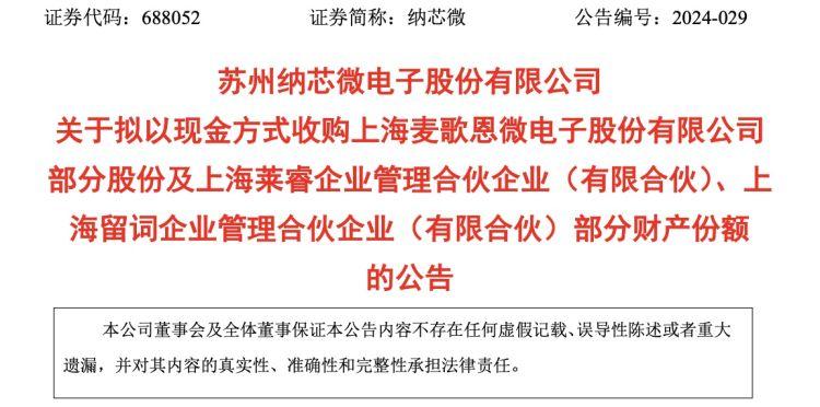 纳芯微6月23日公告称,拟以现金方式收购上海麦歌恩微电子合计79.31%的股份,收购对价合计达7.93亿元。