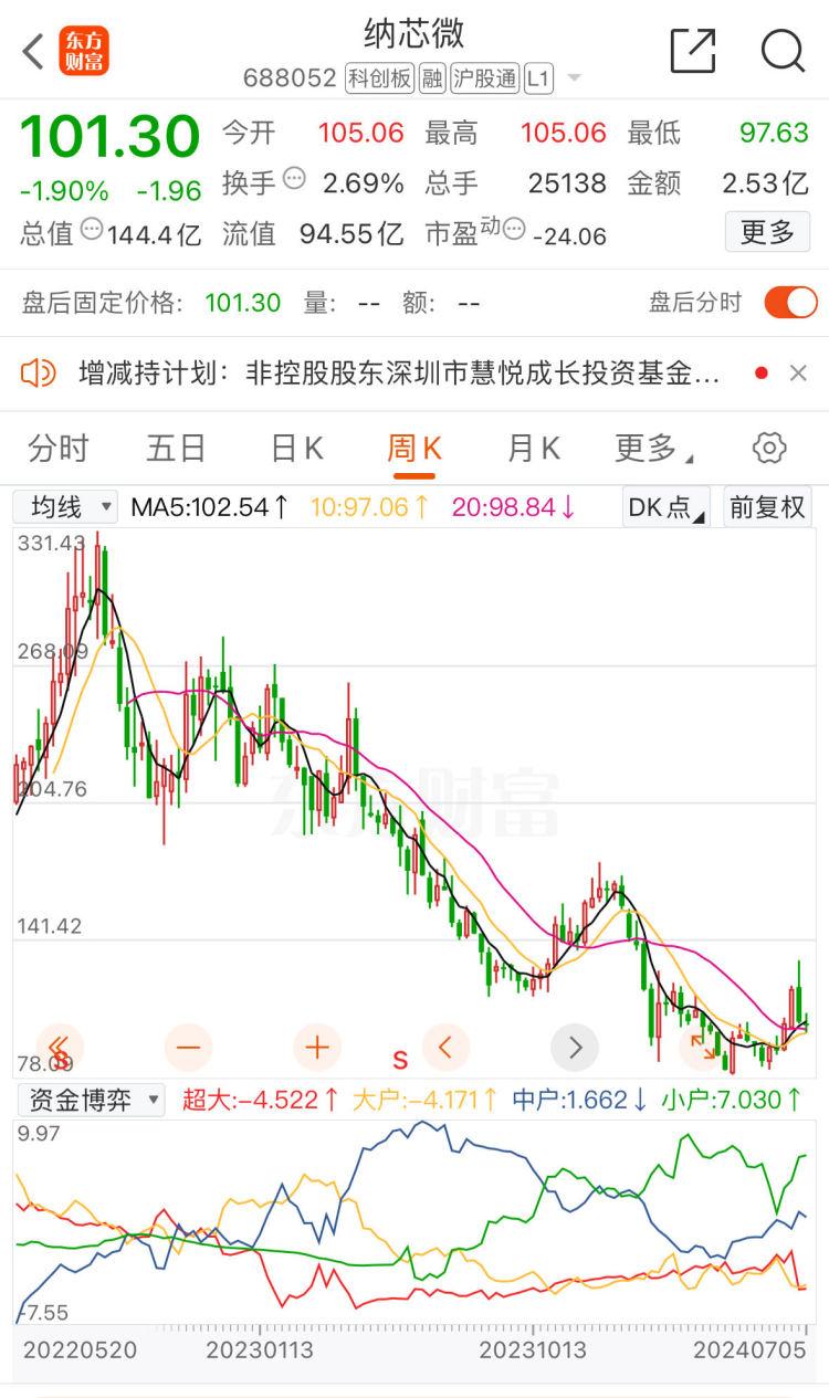截至7月5日收盘,纳芯微跌1.90%报101.30元/股,股价长期处于破发状态,现总市值144.38亿元。