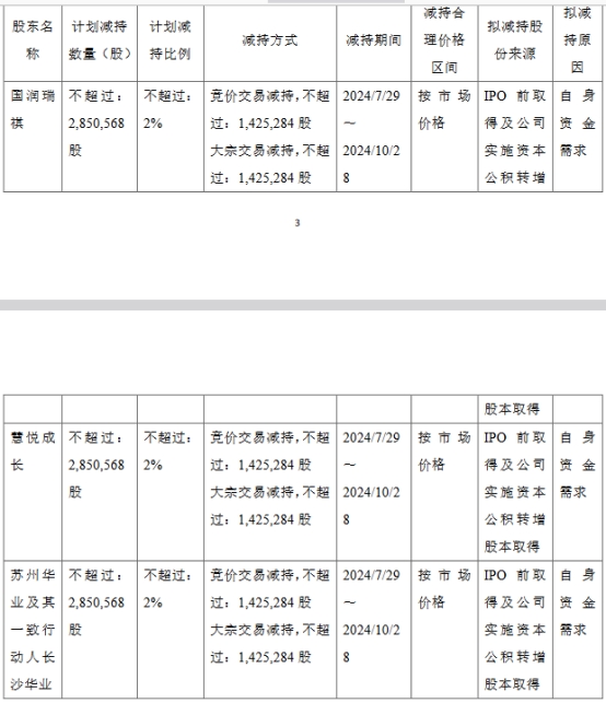 因自身资金需求,公司股东苏州华业致远一号创业投资合伙企业(有限合伙)(以下简称“苏州华业”)及其一致行动人苏州华业的一致行动人长沙华业高创私募股权基金合伙企业(有限合伙)(以下简称“长沙华业”)拟在减持计划披露的减持期间内,累计减持不超过2,850,568股,即不超过公司总股本的2%,其中通过大宗交易方式减持不超过1,425,284股,减持股份占公司总股本的比例不超过1%,通过竞价方式减持不超过1,425,284股,减持股份占公司总股本的比例不超过1%。通过竞价交易方式减持的,自本次减持股份计划公告披露之日起15个交易日后的3个月内进行;通过大宗交易减持的,自本次减持股份计划公告披露之日起3个交易日后的3个月内进行。