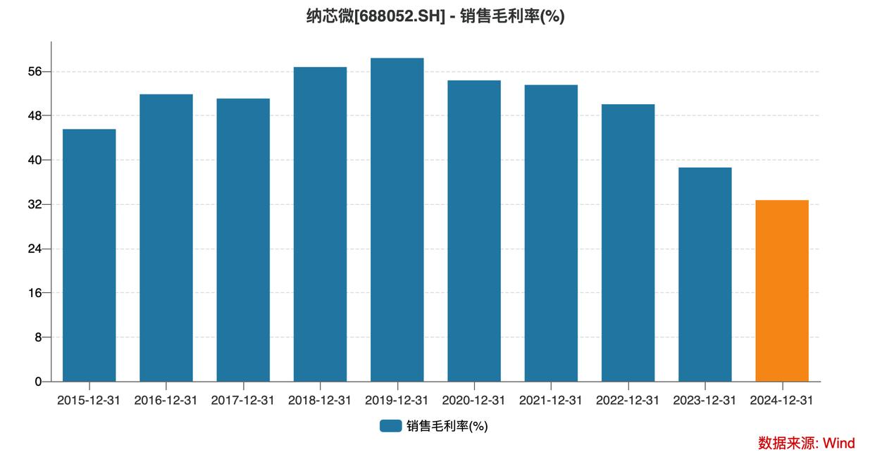 2024年,纳芯微的传感器、信号链、电源管理、定制服务产品毛利率全线下滑,分别为43.8%、37.6%、22.4%、-165.3%,下滑比例分别为8.2%、2.9%、7.1%、244.1%。公司的整体销售毛利率降低至历史低点32.7%。