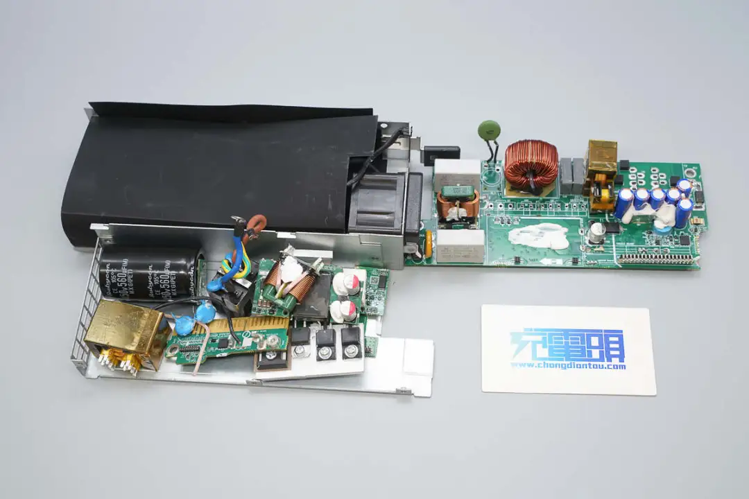 PFC开关管采用圣邦SGM48000驱动器,LLC开关管采用纳芯微NSI6602BD隔离驱动器,同步整流管采用安森美FAN3225T驱动器,辅助电源芯片采用英飞凌ICE5QR1680AG。高压滤波电容来自万裕,滤波固态电容来自钰邦,变压器两侧焊接PCB,焊接同步整流管加强散热和载流。电源内部设计紧凑,做工用料扎实可靠。