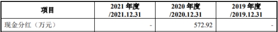 2020年,思科瑞现金分红572.92万元。公司2020年股东会审议通过《成都思科瑞微电子有限公司 2019 年股东会决议》,以2019年末的持股比例为依据,向全体股东分配572.92万元。