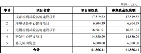 思科瑞2022年7月5日披露的招股书显示,公司拟募集资金61,856.41万元,分别用于成都检测试验基地建设项目、环境试验中心建设项目、无锡检测试验基地建设项目、研发中心建设项目、补充流动资金。