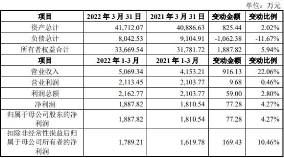 2022年1-3月,思科瑞营业收入为5,069.34万元,同比增长22.06%;净利润为1,887.82万元,同比增长4.27%;归属于母公司股东的净利润为1,887.82万元,同比增长4.27%;扣除非经常性损益后归属于母公司所有者的净利润为1,789.21万元,同比增长10.46%。