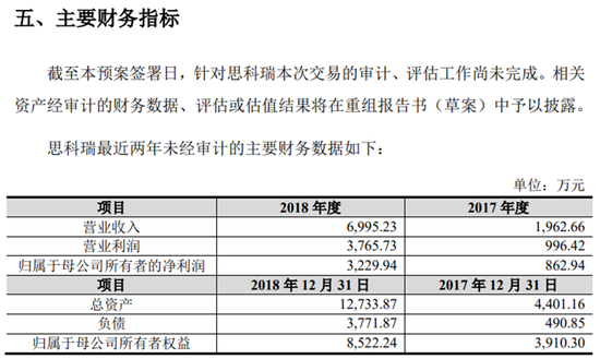 早在2019年6月,上市公司航锦科技(000818.SZ)发布了一份购买资产预案,其中就包括计划以9.1亿元的整体思科瑞100%的股权。根据航锦科技当时的信息披露,思科瑞2018年实现营业收入6995.23万元、归母净利润为3229.94万元。