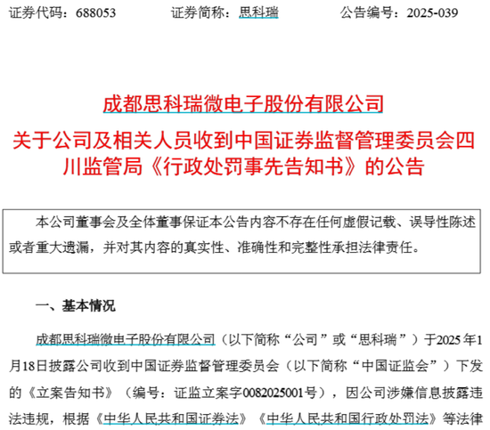 最近,上市公司思科瑞(688053.SH)发布了一份公告,收到四川监管局下发的《行政处罚事先告知书》,经查明2022年年度报告存在虚假记载,虚增营业收入996.04万元,虚增利润总额700.54万元。因此,思科瑞被警告并处以200万元罚款,多名相关责任人也分别被警告并处以罚款。