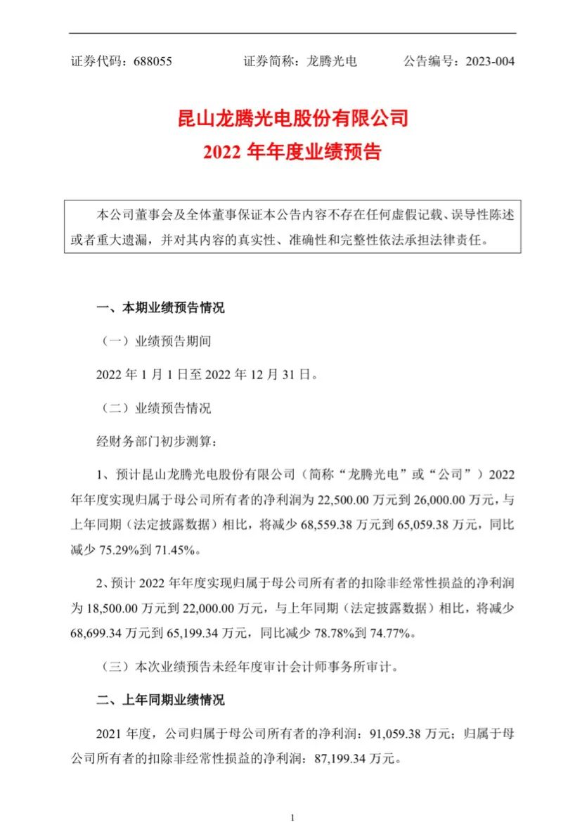 2 月 1 日消息,龙腾光电发布了 2022 年年度业绩预告,预计 2022 年净利润为 2.25 亿元到 2.6 亿元,与上年同期相比,同比减少 75.29%到 71.45%。