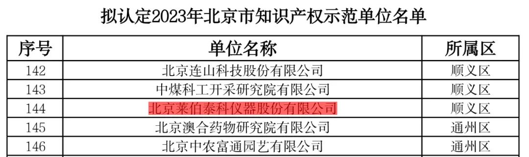 近日,北京市知识产权局根据《北京市知识产权试点示范单位认定与管理办法》(京知局〔2020〕171号)组织开展了2023年北京市知识产权试点示范单位申报评审工作及2020年度北京市知识产权试点示范单位复审工作。经初审、形式审核和专家评审,北京莱伯泰科仪器股份有限公司(以下简称“莱伯泰科”)被认定为2023年“北京市知识产权示范单位”。
