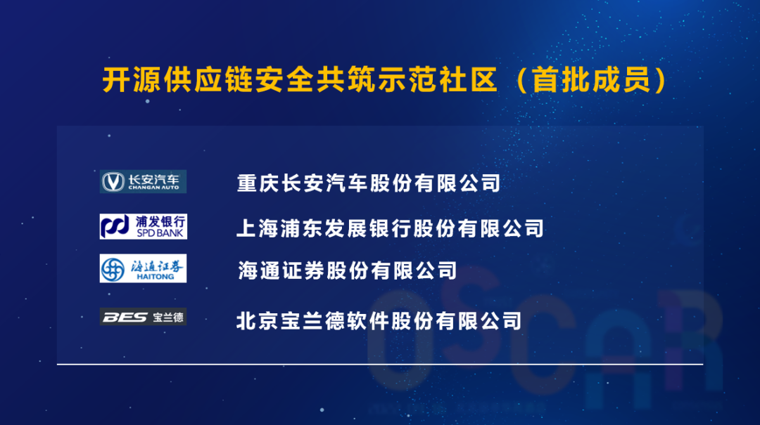 会上,中国信通院牵头成立开源供应链安全共筑示范社区,社区首批示范成员单位均完成中国信通院软件产品开源代码安全试评估,在代码来源、代码质量、知识产权可控性和产品成熟度等方面均有提升。宝兰德与长安汽车、浦发银行、海通证券共同成为开源供应链安全共筑示范社区的首批成员。