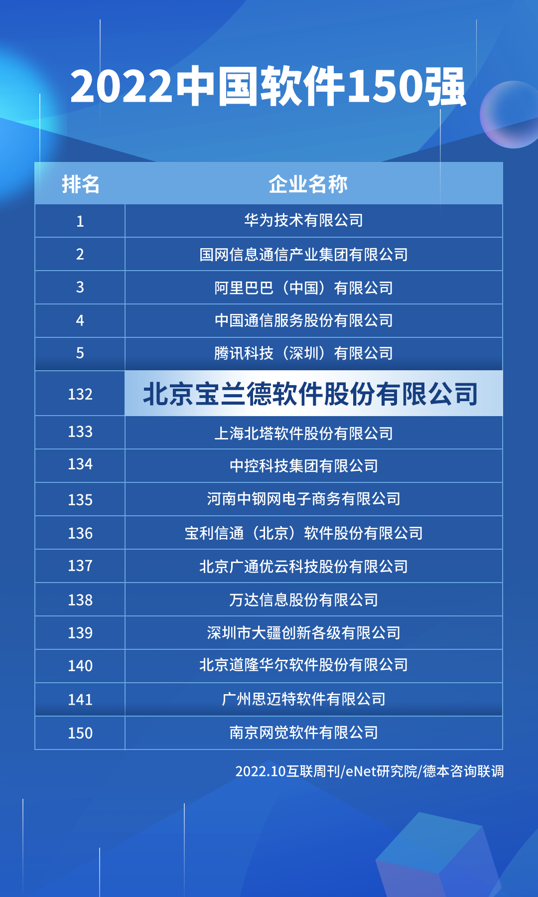 近日,由互联网周刊、eNet研究院、德本咨询联合调研发布的“2022中国软件150强”榜单,宝兰德凭借在基础软件领域的技术创新能力、产品服务质量以及落地项目的示范影响力上榜。