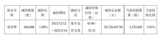 目前,张东晖减持了56万股,减持价格区间为43元至52.35元,已经套现2473.84万元。