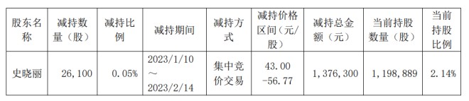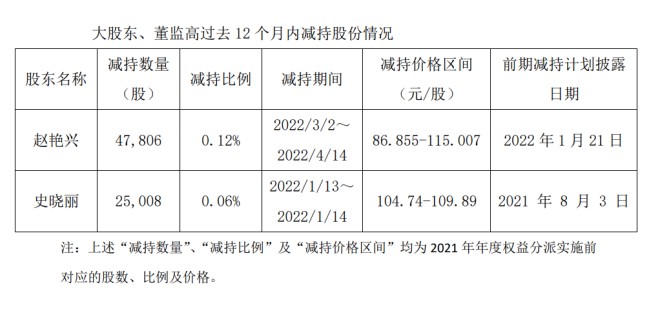 此前,在过去的12个月内,赵艳兴、史晓丽均实施过股份减持。其中,赵艳兴减持47806股,减持价格区间为86.855元至115.007元,至少套现415.22万元;史晓丽减持25008股,减持价格区间为104.74元至109.89元,至少套现261.93万元。