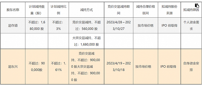 因个人资金需求,易存道计划自2023年4月28日起后的6个月内,通过大宗交易、集中竞价(含盘后固定价格交易,下同)方式减持所持有的公司股份合计不超过1,680,000股,即不超过公司总股本的3%。