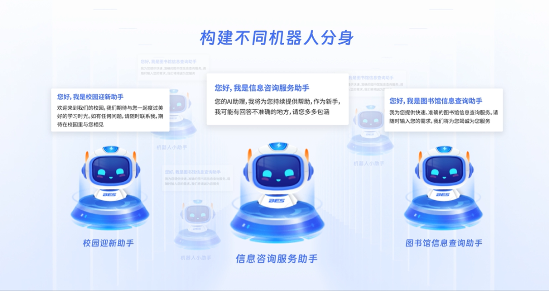 宝兰德AI机器人可以20秒内、三个步骤构建高校智能问答机器人,快速支撑智能问答、智数图析相关场景,还可以与校内不同学院、部门的文档知识、课程知识和门户网站知识进行深度结合,为高校提供人性化对话的迎新服务、学生咨询、招生咨询、就业指导、课程指导和信息服务,在数字化和智能化的校园咨询领域凸显价值。