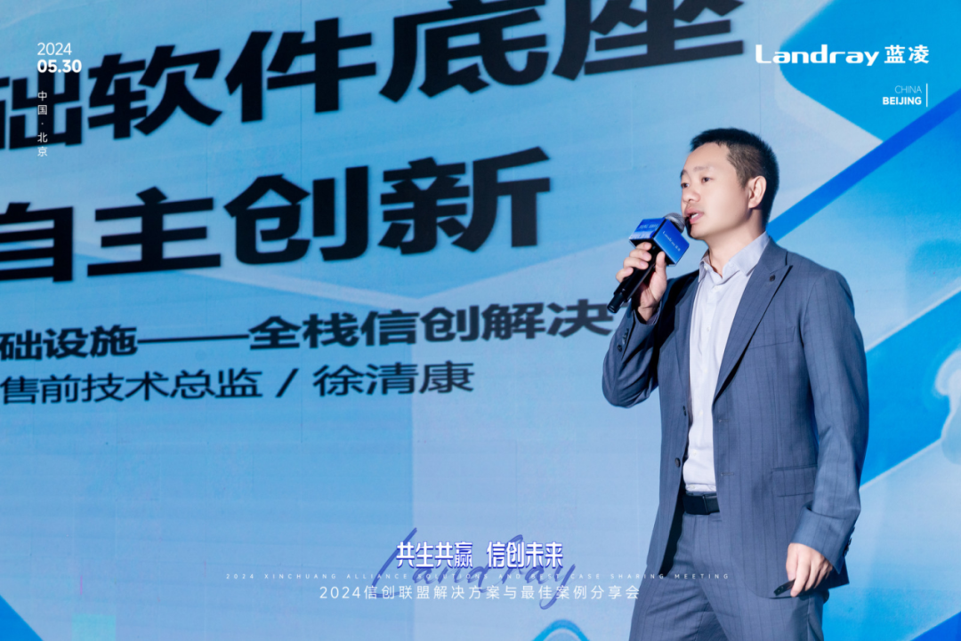 签约仪式后,宝兰德金融行业售前总监徐清康,做主题为《夯实基础软件底座践行自主创新》的演讲,他详细介绍了宝兰德应用架构基础设施——全栈信创解决方案,并结合应用实践案例,充分彰显了宝兰德在运营商、金融、党政等关键行业的优秀创新方案、领先技术成果及丰富服务经验。