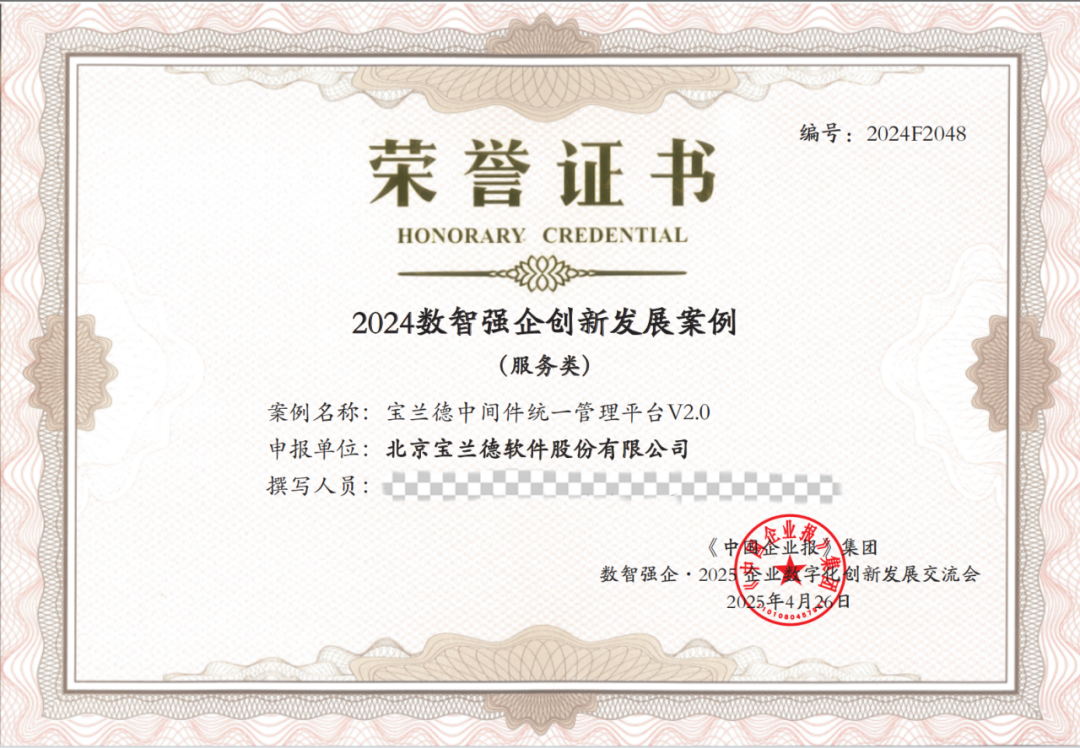近日,由《中国企业报》集团主办的数智强企·2025企业数字化创新发展交流会在北京举行,会议邀请了产学研各界精英,共商企业数字化转型和数智化发展之道,助力企业把握时代机遇,实现高质量发展。宝兰德「中间件统一管理平台V2.0」成功入选“2024数智强企创新发展案例”(服务类)。