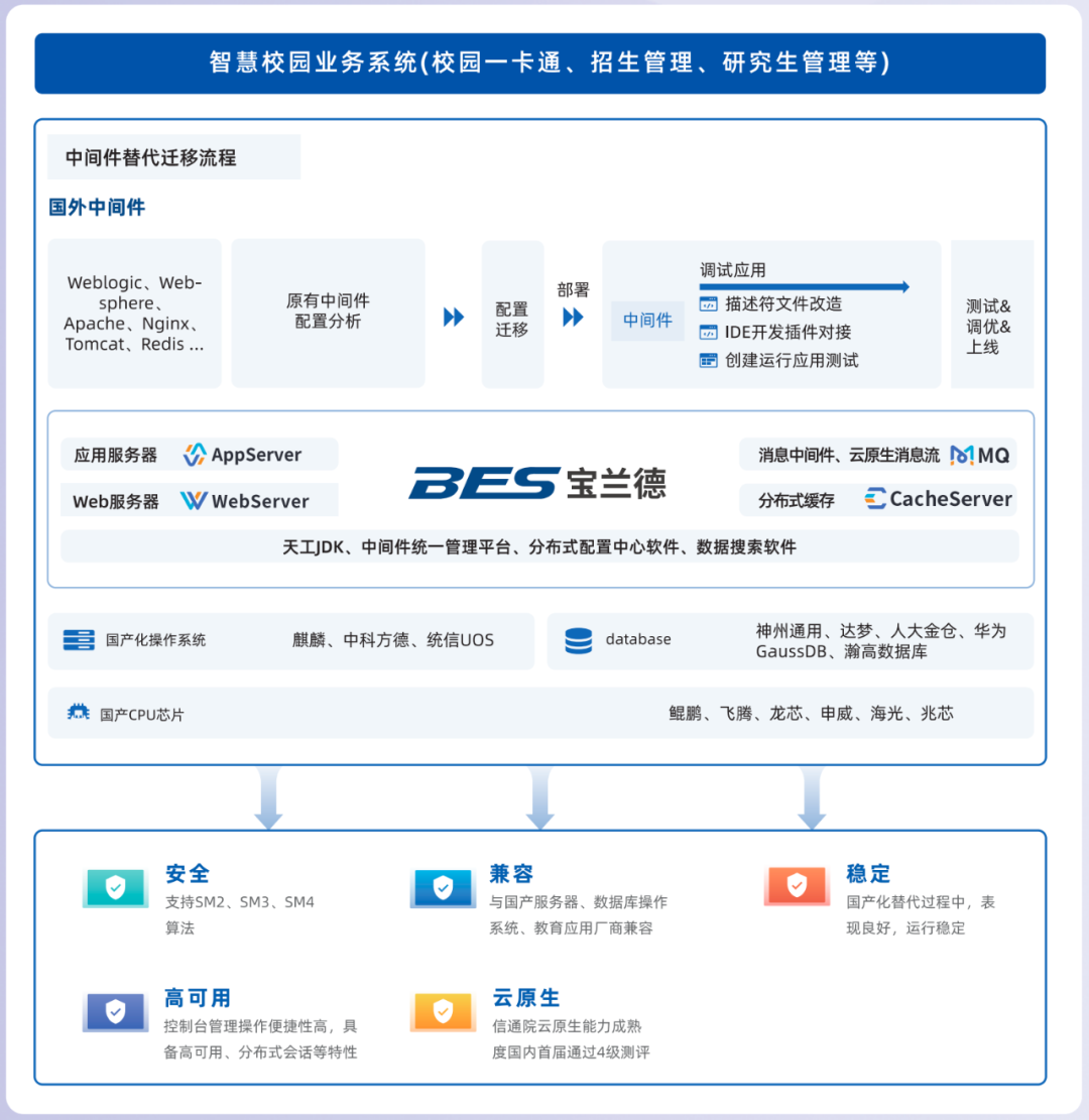 中间件是衔接操作系统、数据库与应用软件的枢纽,可优化资源交互提升系统效能。宝兰德完全自主研发全栈信创中间件解决方案含应用服务器中间件、分布式缓存中间件、Web服务器中间件、消息中间件、云原生消息流、天工JDK和中间件统一管理平台,依托十余年行业经验,具有高可靠性、高性能、易运维等技术特性,部署场景多元化,尤其独创 EJB 私有化协议、异步非阻塞通信机制、多数据源智能管理等核心技术,为教育信创改造提供全栈支撑,助力教育数字化转型实现稳定性与创新性的双重突破。