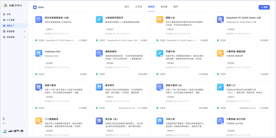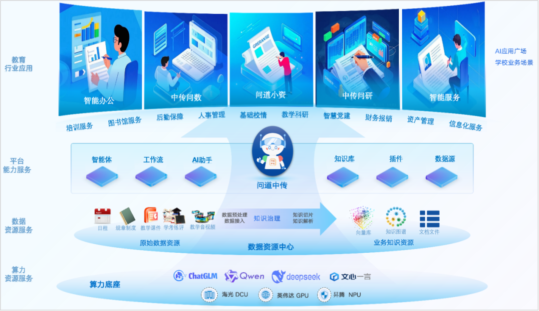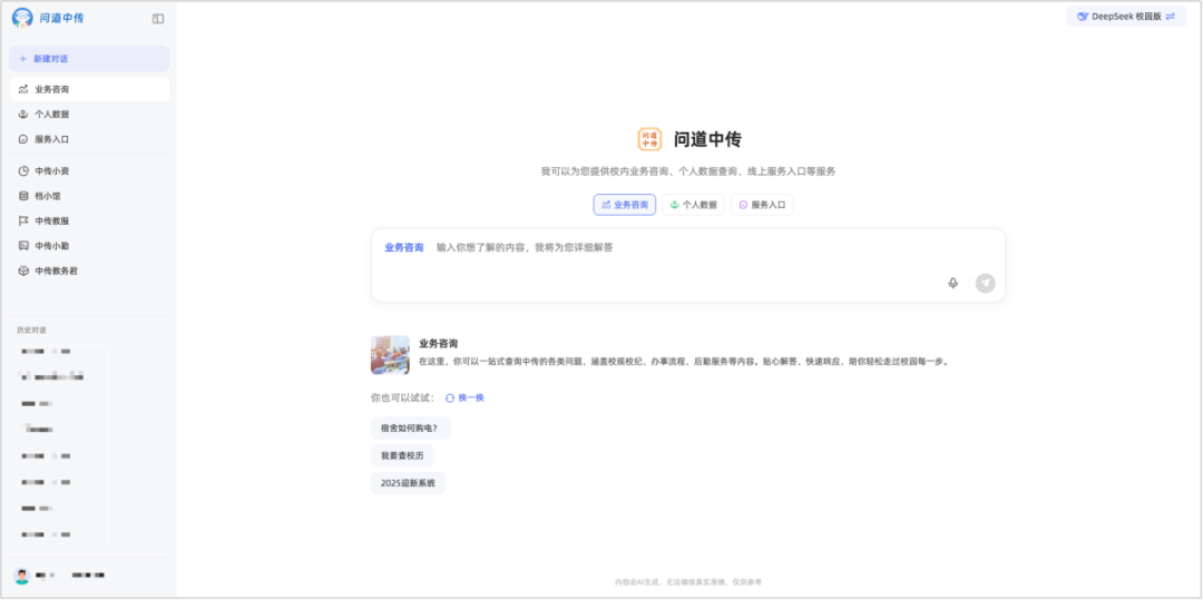 1个“问道中传”+N(40+)“业务智能体”,问道中传构建AI范式下统一咨询入口,“N”个智能体由业务部门搭建,基于业务复杂度不断衍生,共同创建一个集面向学生/教师学习、生活、工作于一体的AI助手。