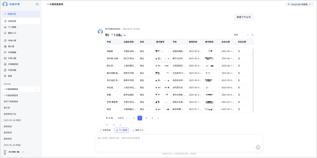 师生可以便捷获取校园卡使用情况、成绩信息及课程安排,大幅提升日常查询效率。同时,针对图书及图书借阅场景,中传问道构建了专业问数模块,支持图书信息检索和借阅状态查询,优化图书馆服务体验。基于多场景的智能问数能力,中传问道致力于推动校园信息服务的智能化进程,助力智慧校园建设不断发展。