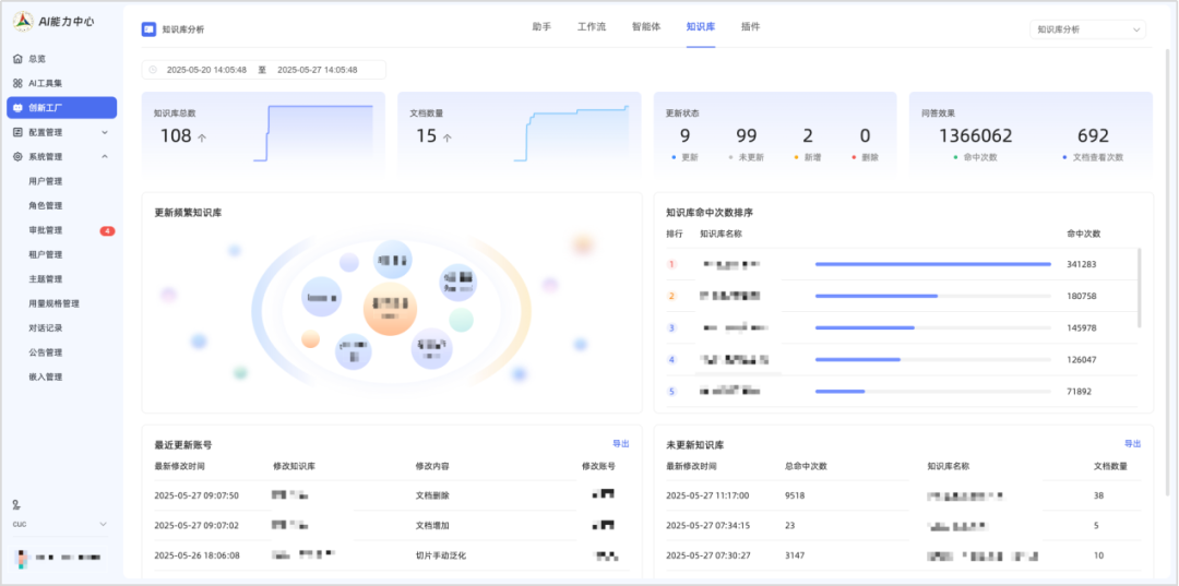 ③知识库运营分析:知识库治理是周期性持续管理工作,知识库运营分析界面提供知识库活跃度、更新状态等信息呈现