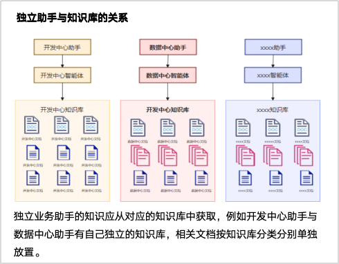 ②知识库构建规范:由于助手存在两级嵌套能力,在构建知识库时可根据当前业务诉求拆分或组合文档构建知识库,增加问答准确率。