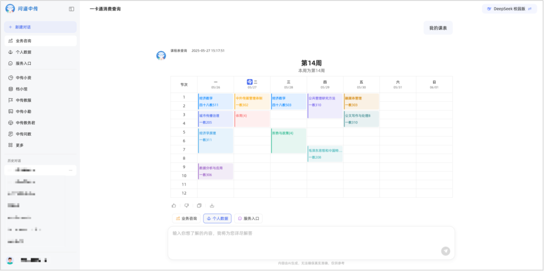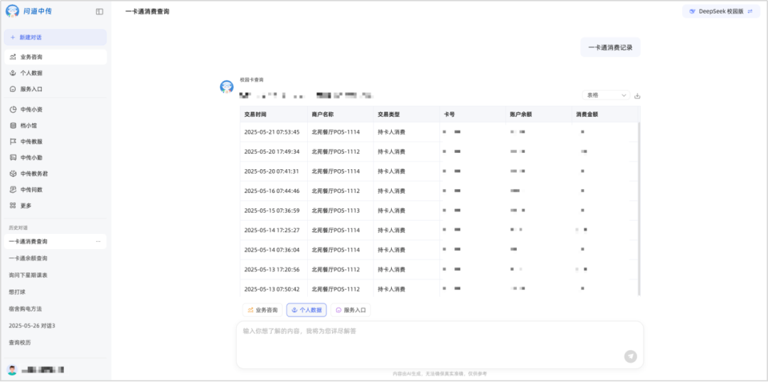 问道中传针对校园多样化需求,提供覆盖一卡通、成绩和课程的智能问数服务,实现信息查询的快速响应与精准解答。