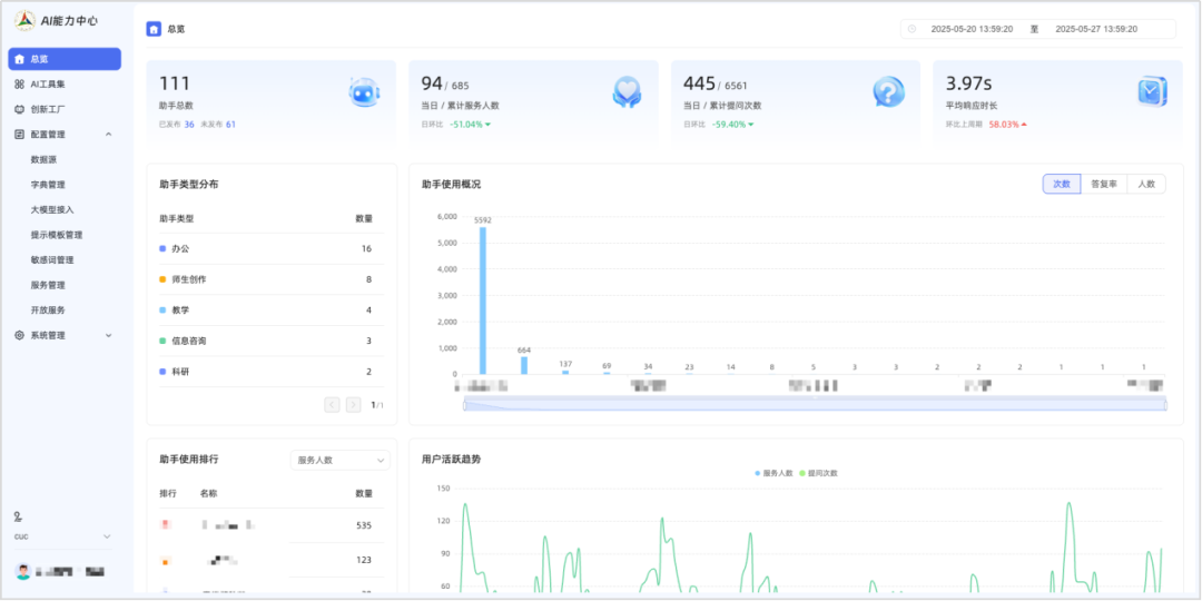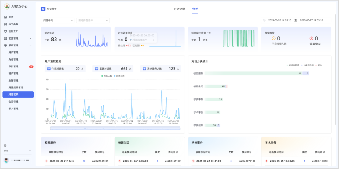 问道中传以数据驱动的运营与分析能力,为高校智能服务构筑起高效、安全、可持续的管理体系。系统通过对用户使用情况的精准洞察,帮助管理者快速定位关键信息;同时基于对话数据实现风险抓取与预警,确保服务合规与安全;并结合知识库活跃度与更新状态的持续呈现,支撑知识库的周期性治理与迭代优化。三者协同作用,不仅提升了校园智能服务的响应效率与安全性,也为智慧校园的可持续发展注入了坚实动力。