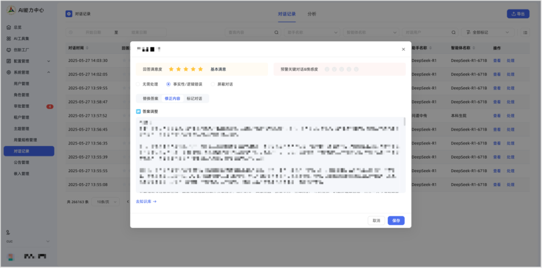 问道中传通过完善的资源治理与权限管理机制,全面保障高校AI应用的安全合规与高效运转。平台支持助手的发布—审批—上线全流程管理,确保服务上线的规范与可控;在数据安全层面,从用户维度细化权限控制,实现知识库、助手及对话记录等AI资源的读写分离,保障信息使用的边界清晰;同时,数据库表支持可视化治理,并提供问题改写与近义词管理能力,显著提升知识库的灵活性与智能化水平。多重能力协同作用,为智慧校园建设提供了稳固、安全、可持续的技术底座。