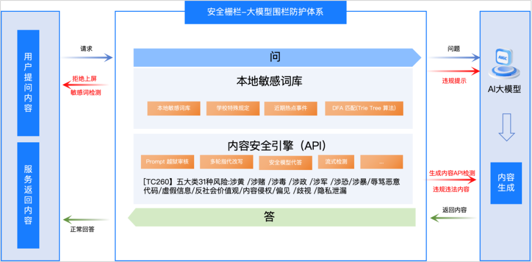 在内容安全建设中,中传问道采用“本地敏感词库+第三方API”双重策略,共同搭建起高校场景下的内容安全栅栏。本地词库采用高校的字符串匹配算法进行预处理,迅速处理显性、固定的敏感词;而第三方API则补充对复杂、动态敏感内容的识别能力。双层机制协同控制,不仅提高过滤的全面性和精准度,也为高校智能问答服务构筑了稳固的安全防线,助力校园数字化应用在安全合规的前提下稳步推进。
