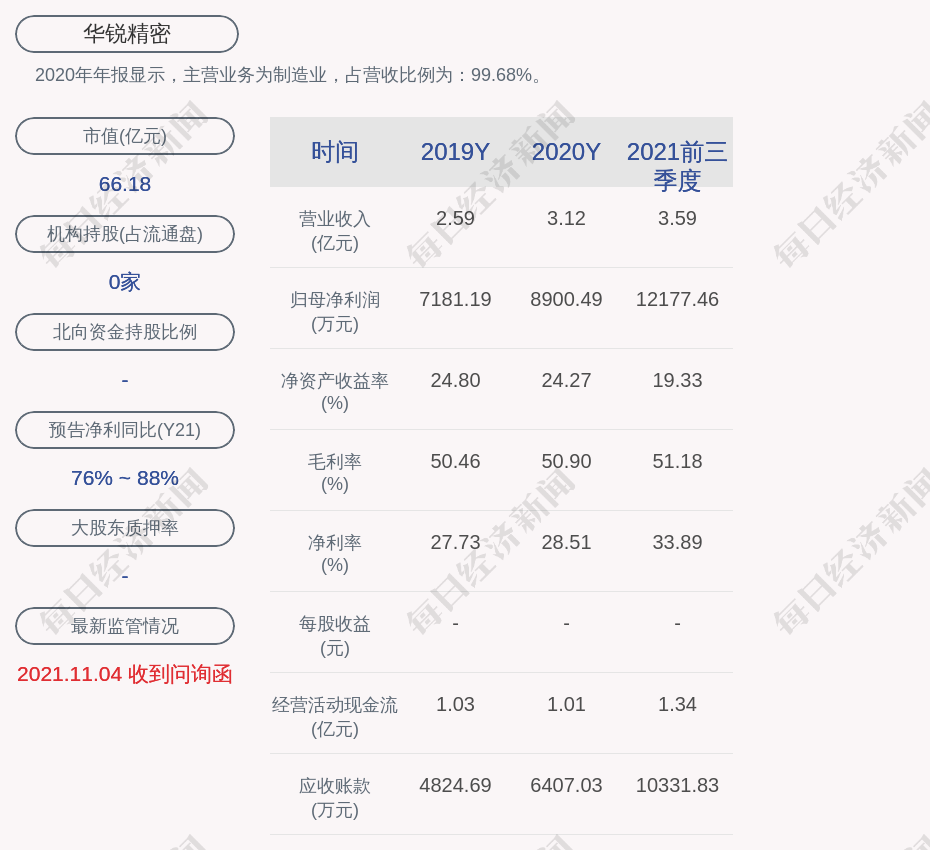 2020年年报显示,华锐精密的主营业务为制造业,占营收比例为:99.68%。