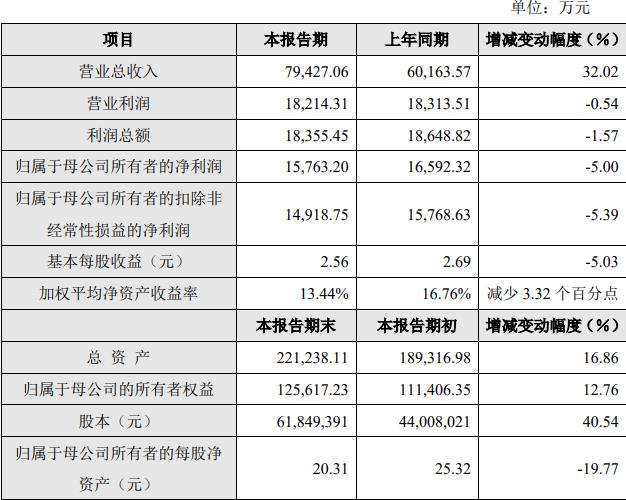 据华锐精密2023年度业绩快报公告,公司2023年度实现营业收入79,427.06万元,与去年同期相比上升32.02%;实现营业利润18,214.31万元,与去年同期相比下降0.54%;实现利润总额18,355.45万元,与去年同期相比下降1.57%;实现归属于母公司所有者的净利润15,763.20万元,与去年同期相比下降5.00%;实现归属于母公司所有者的扣除非经常性损益的净利润14,918.75万元,与去年同期相比下降5.39%。