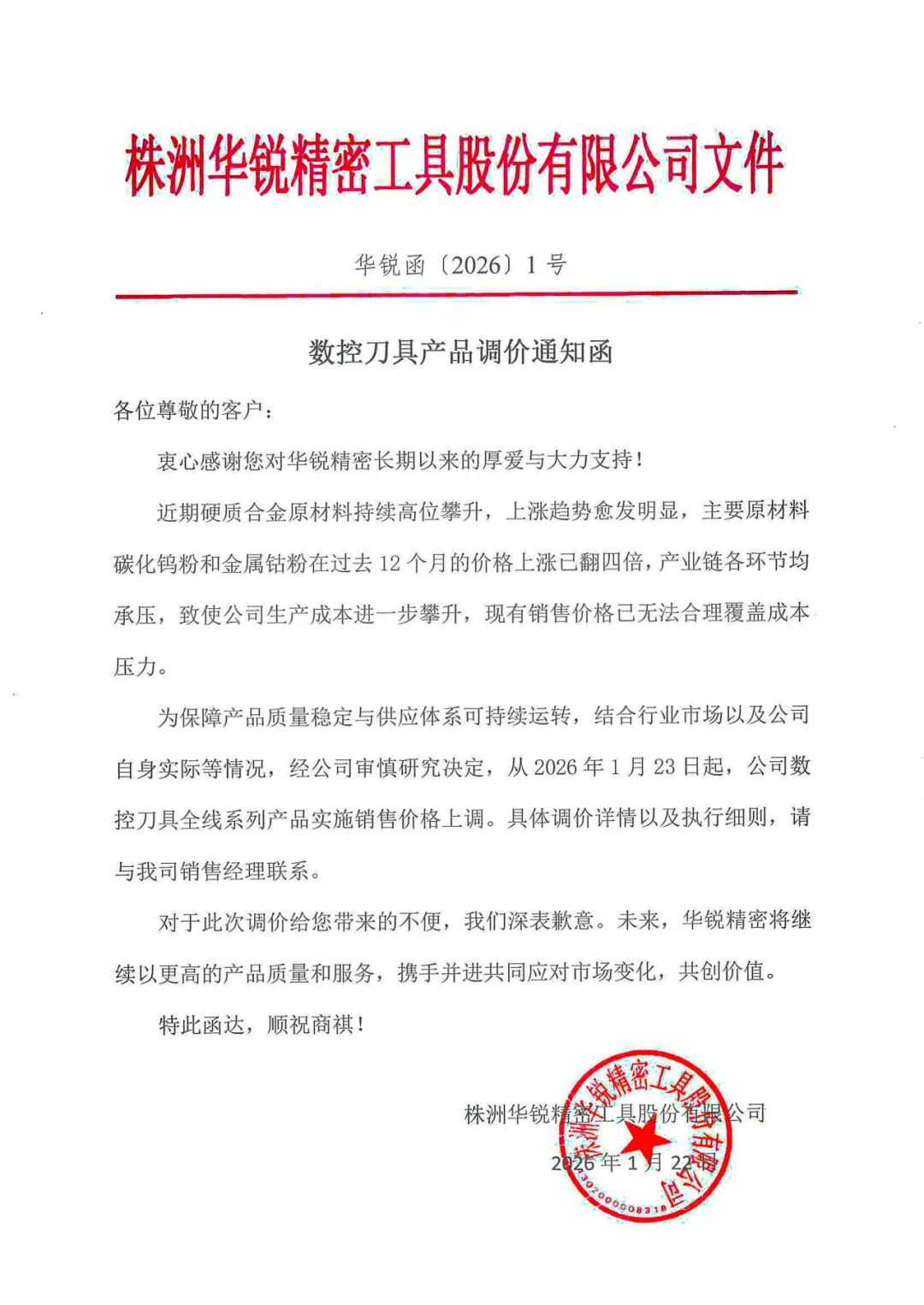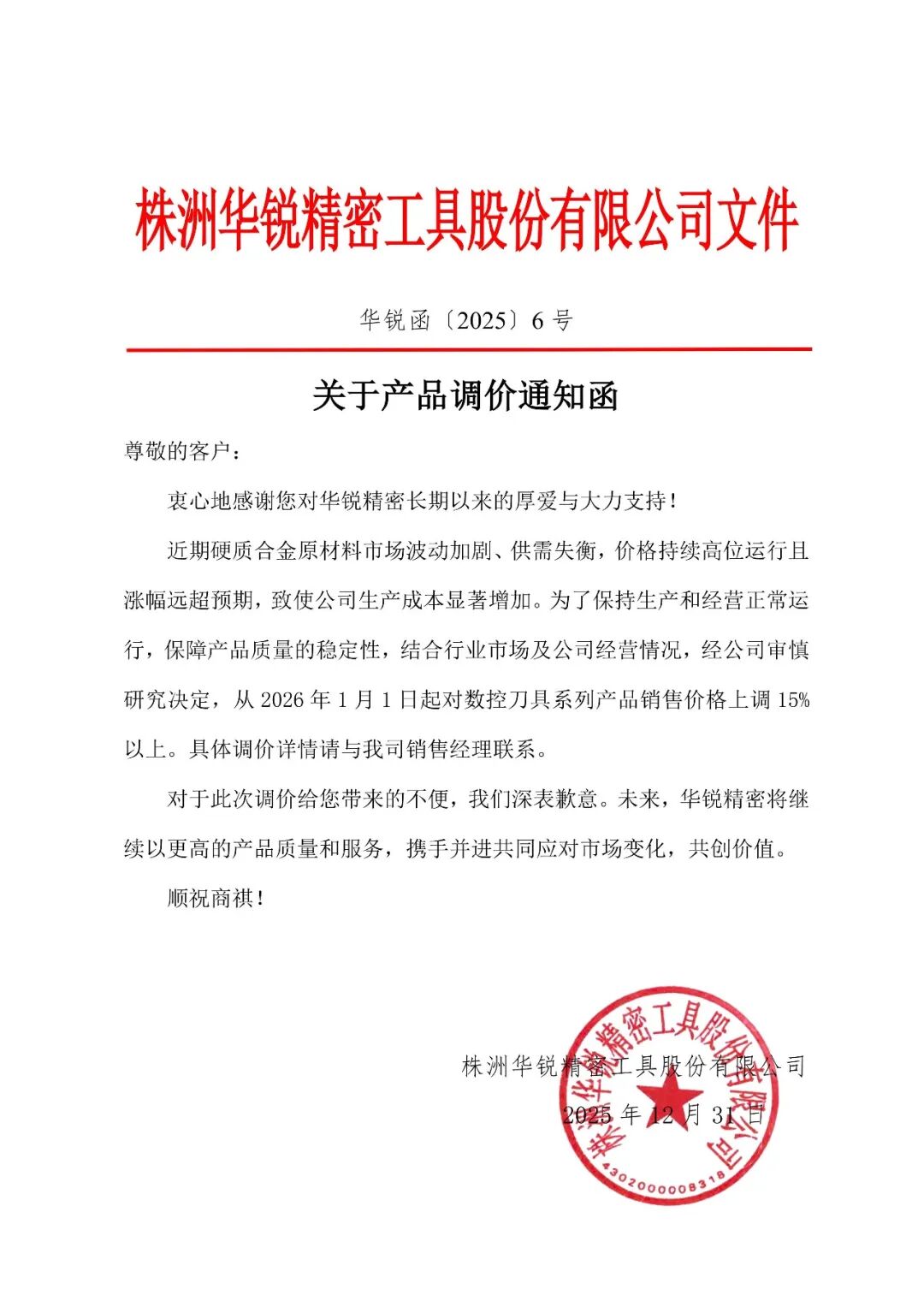 近期,钨粉、钴粉等原料价格持续上涨,公司成本端压力持续上升,为保障后续产品的稳定供应与优良品质,故对产品相应采取涨价措施。现将相关情况及核心依据说明如下,恳请您理解与体谅!